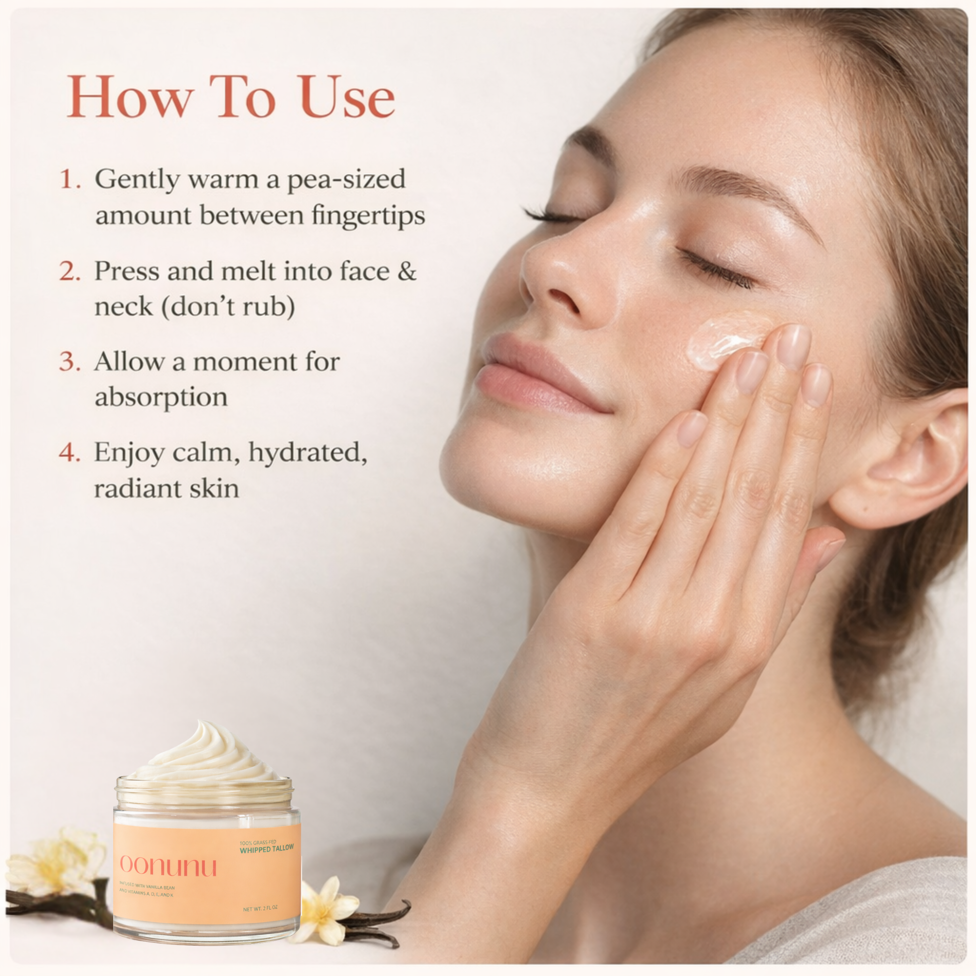 A little goes a long way. Warm a small amount between your palms and press into clean skin. The whipped texture melts instantly.