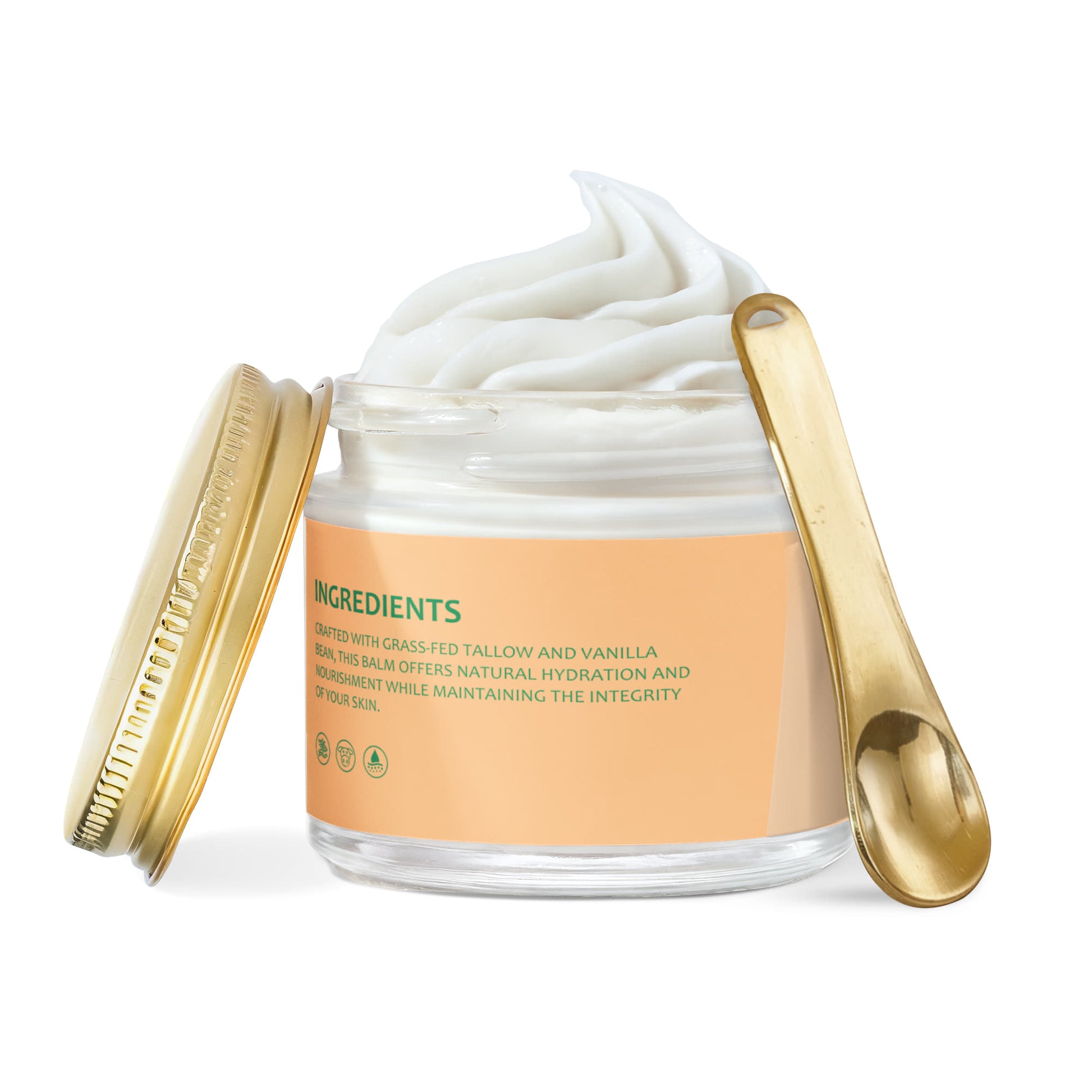 Whipped Tallow Balm works on contact to restore compromised, dry, or irritated skin. Its bioidentical lipid structure penetrates deeply, instantly softens, and rebuilds your barrier, giving you that healthy, resilient glow. Grass-fed tallow's vitamins A, D, E, and K repair damage for hours, while vanilla bean's antioxidants calm irritation and protect against environmental stress.